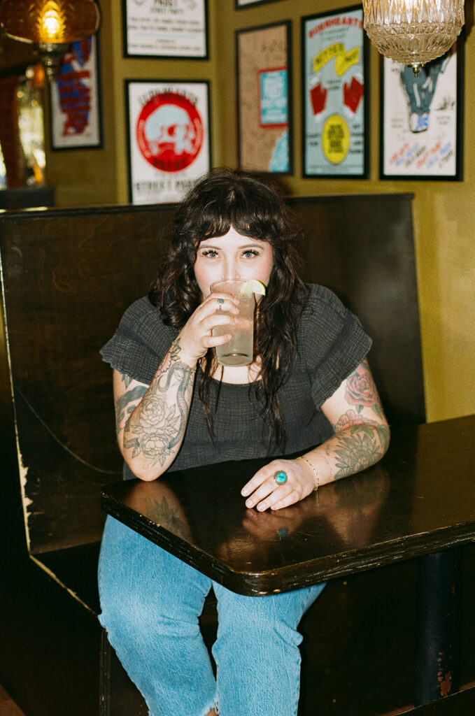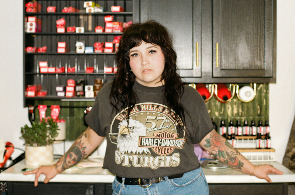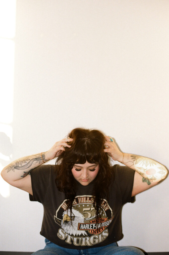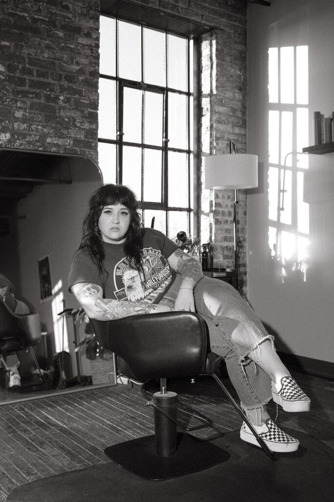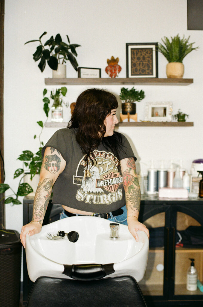It’s the kind of place where you instantly know what you’re walking into. And that matters because Allie is intentional about who she’s calling in. She wants clients who feel like her people: alt, expressive, & maybe a little edgy. Clients seeking shags, pixies, vivid color, or a soft lavender gloss over lived-in balayage will feel right at home in Allie’s chair. Her space is where clients feel seen, heard, and accepted which is why we spent half the session photographing in it.