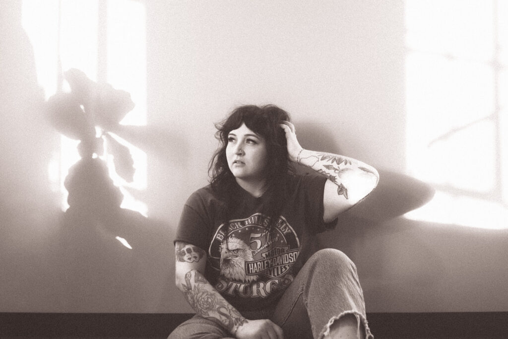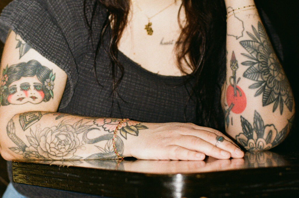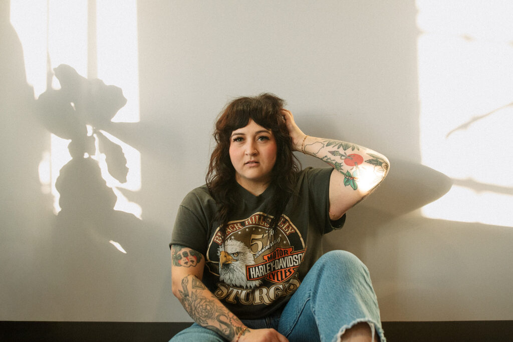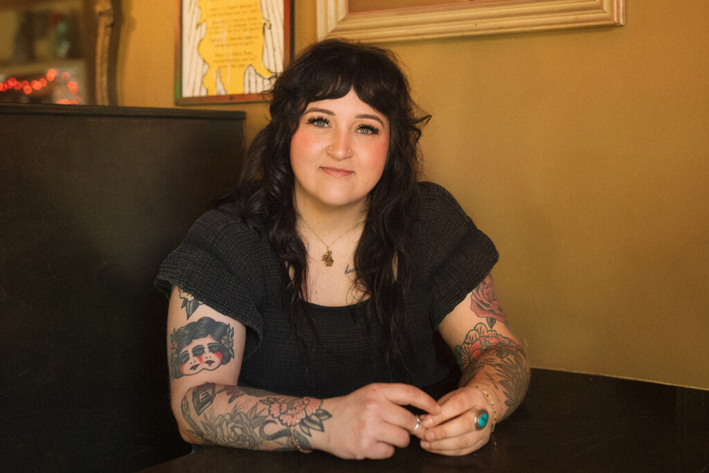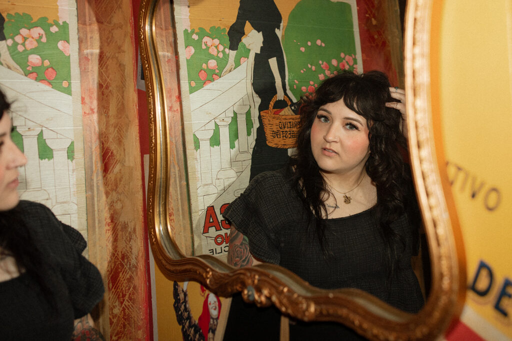 It’s the kind of place where you instantly know what you’re walking into. And that matters because Allie is intentional about who she’s calling in. She wants clients who feel like her people: alt, expressive, & maybe a little edgy. Clients seeking shags, pixies, vivid color, or a soft lavender gloss over lived-in balayage will feel right at home in Allie’s chair. Her space is where clients feel seen, heard, and accepted which is why we spent half the session photographing in it.
