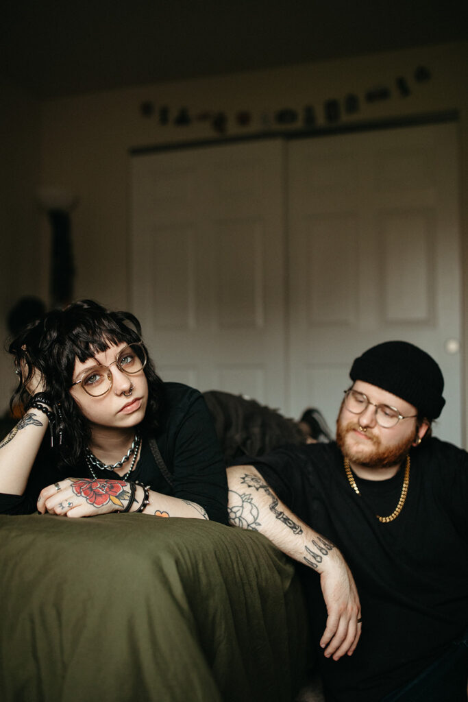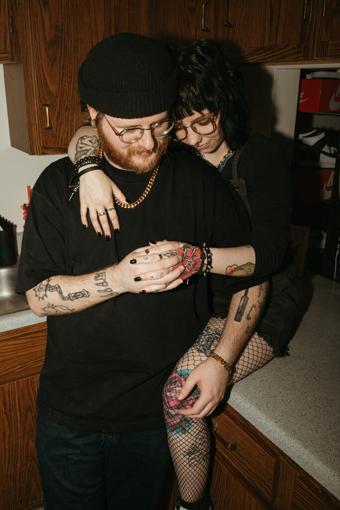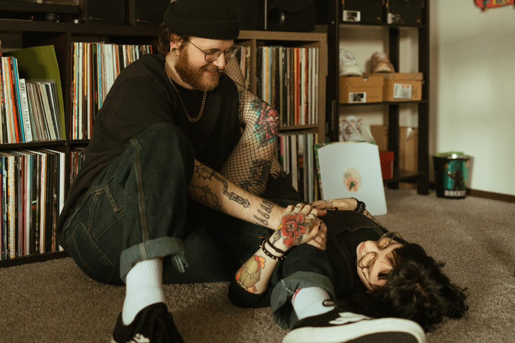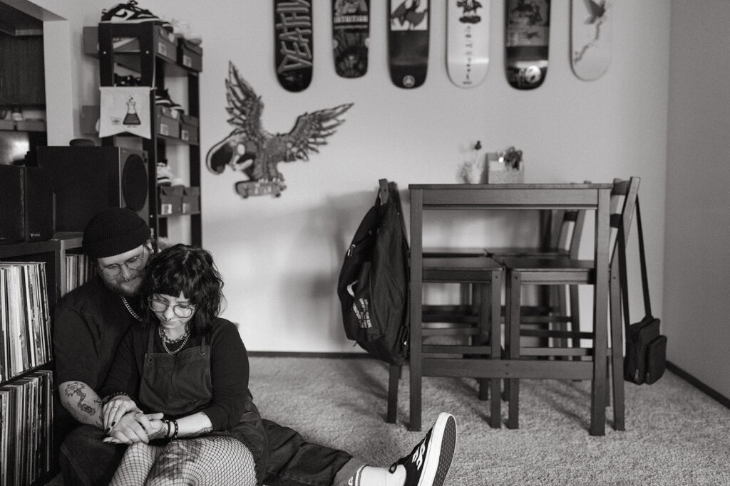 The details of their 8-year relationship (altogether) might shift depending on who’s telling it, but one thing stayed consistent: music was there from the start. A Forest Green CD was one of the first things they bonded over, which honestly says everything. Without that shared love, there may be no Lauren & Jer, so we leaned into it fully. Their apartment holds all of that history. Records stacked and scattered, instruments within reach, skateboards on the walls, plants tucked into every corner, magnets collecting on the fridge. Nothing about it felt staged, which is exactly the point.